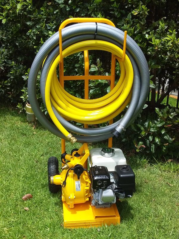 Our Urban Fire Fighter allows you to use the total volume of your pool or rainwater tank to protect your home in case of fire by simply placing the pick up hose directly into your pool (or connect to rainwater tank) connecting it to the trolley mounted pump and connecting your fire hose with it's quick connect fitting, prime the pump and away you go!